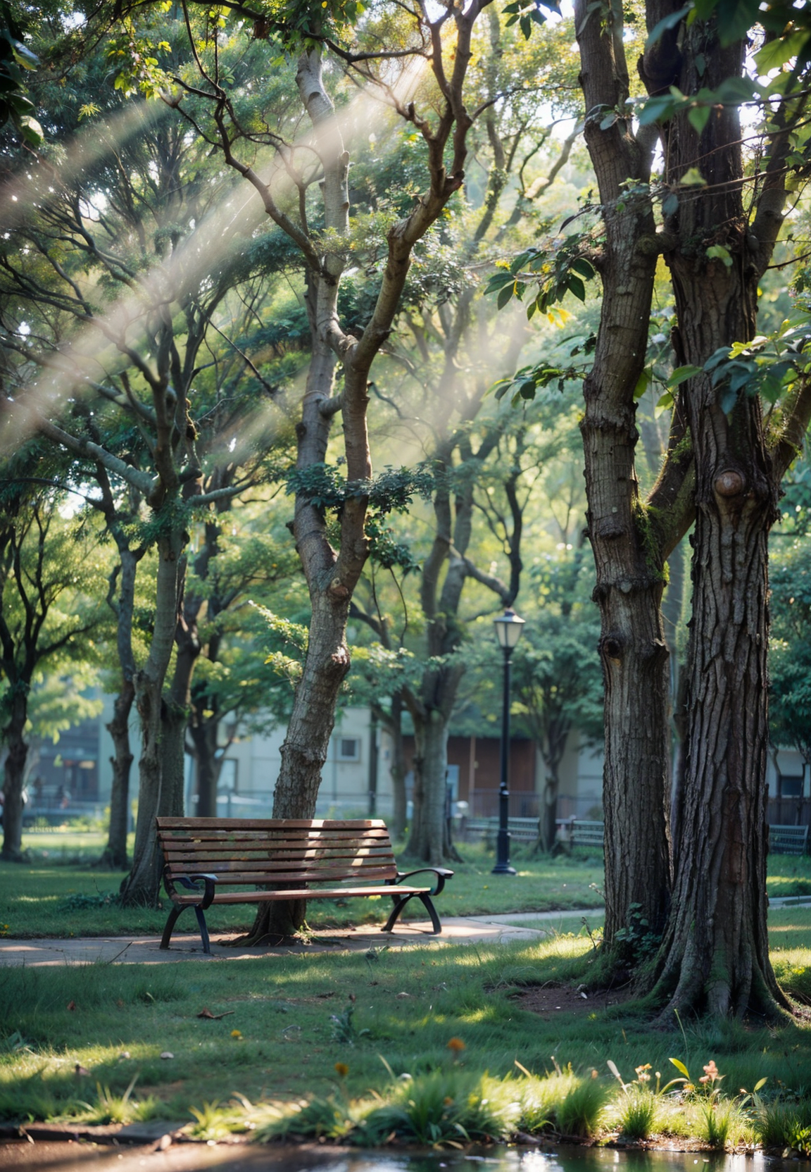 green tree, green grass, park chair, foggy, ((back light)), light through fog, (masterpiece),((ultra-detailed)), (highly detailed CG illustration),(expressionless), (best quality:1.2), High quality texture, intricate details, detailed texture, High quality shadow, Cinematic Light, Depth of field, light source contrast, perspective,20s, (ulzzang-6500-v1.1:0.5), <lora:epi_noiseoffset2:1>, <lora:add_detail:0.8>,