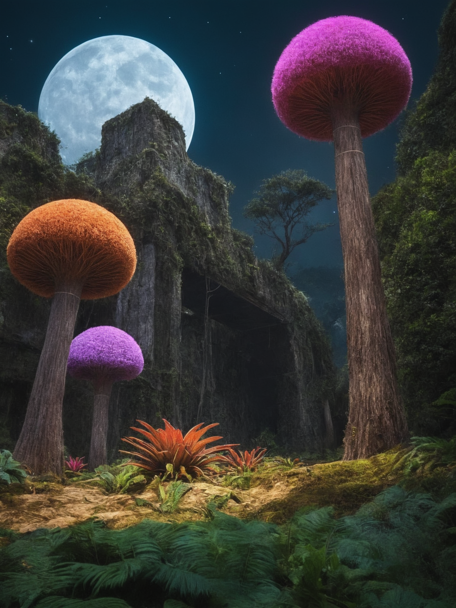 Concept Art,(masterpiece:0.3) high detailed,bright natural lighting,shadows,high contrast,a tropical Forest in alien planet,two big moons in sky,Old civilization ruins,seeing (mythical alien not on earth plantations Neon lights on Flower kind plants) Trees plants and flowers from the ground,view from below,atmospheric dreamscape painting,dream scenery art,highly detailed visionary art,cgi style,vibrant oil painting,splash art,Cozy mystery,masterpiece 8k wallpapper,neoplasticism,Unreal Engine,dramatic lightingvines,overgrown,ink stains,ink splatters,ink runs,ink spots,faded ink,ral-dissolve,linquivera,liiv1,on parchment,