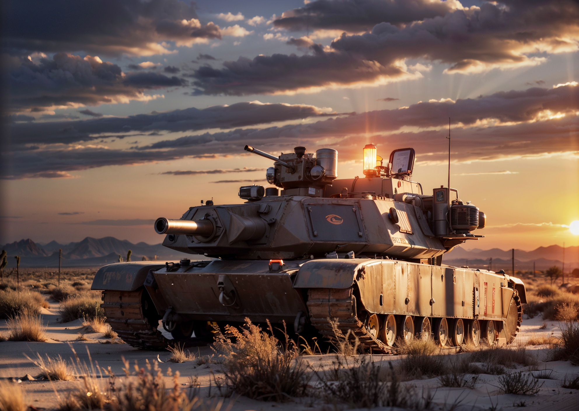 desert, sad color tank, sunset, (masterpiece),((ultra-detailed)), (highly detailed CG illustration),(expressionless), (best quality:1.2), High quality texture, intricate details, detailed texture, High quality shadow, Cinematic Light, Depth of field, light source contrast, perspective,20s, (ulzzang-6500-v1.1:0.5), <lora:epi_noiseoffset2:1>, <lora:add_detail:0.8>,