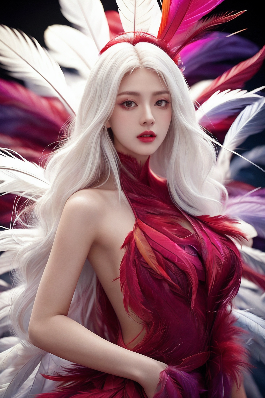 photorealistic,realistic,masterpiece,best quality,ultra-detailed,crystallize,feather,1girl,upper_body,long leg,dress,looking at viewer,red dress,white hair,realistic skin texture,md colorful,<lora:Color palette_20231129204549-000014:0.8:lbw=1,1,0,0,0,1,1,1,1,1,1,1,1,1,1,1,1>,Color palette,