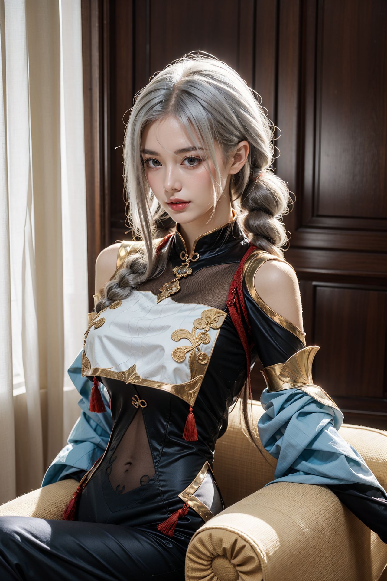 <lora:Shenhe_remake:0.85>, shen_he_(genshin_impact), 1girl, (black bodysuit), (hair ornament), white hair, (braid ponytail), black sleeves, breasts curtain, jewelry, hip vent, shoulder cutout, navel, (upper body:0.7), sitting on the sofa, (masterpiece, high quality, best quality), (colorful),(delicate eyes and face), volumatic light, ray tracing, bust shot ,extremely detailed CG unity 8k wallpaper,solo,outdoors, Luxurious Furniture, Opulent Decor, Elegant Sofa Set, Designer Coffee Table, High-end Lighting, Ornate Accessories, Premium Upholstery, Grand Chandelier, Lavish Interior, Refined Ambiance