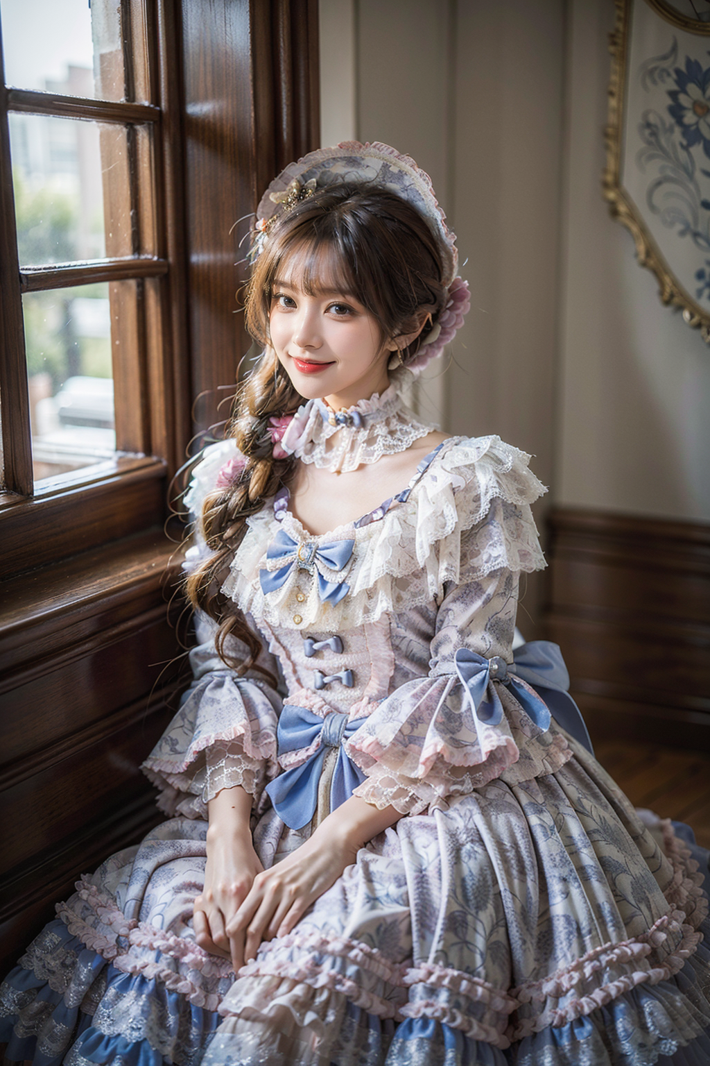 best quality, masterpiece, photorealistic, 1girl, solo, cowboy shot, sitting, long black straight hair, blunt bangs, looking at viewer, smile, lo dress, long dress, layered dress, choker, bow, long sleeves, <lora:lo_dress_vol2_style7_v2:0.65>