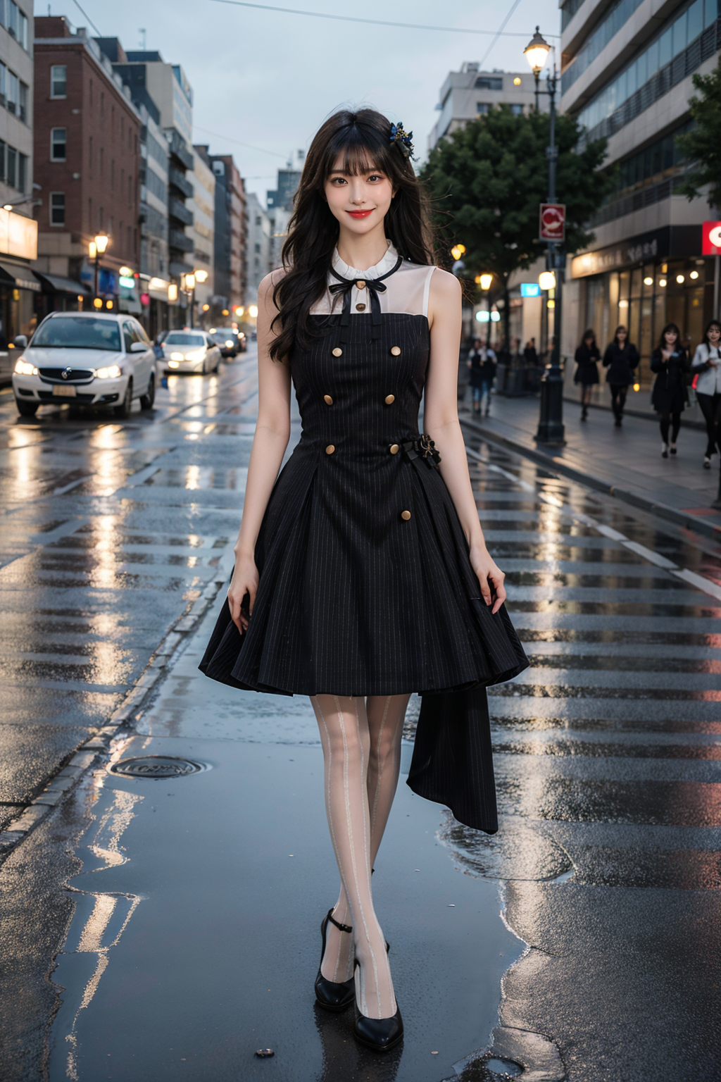 best quality, quality, masterpiece, photorealistic, 1girl, solo, long black hair, blunt bangs, looking at viewer, smile, walking, full body, dating dress, pantyhose, high heels, in street, night, rain, colorful, <lora:dating_attire_style3_v1:0.65>