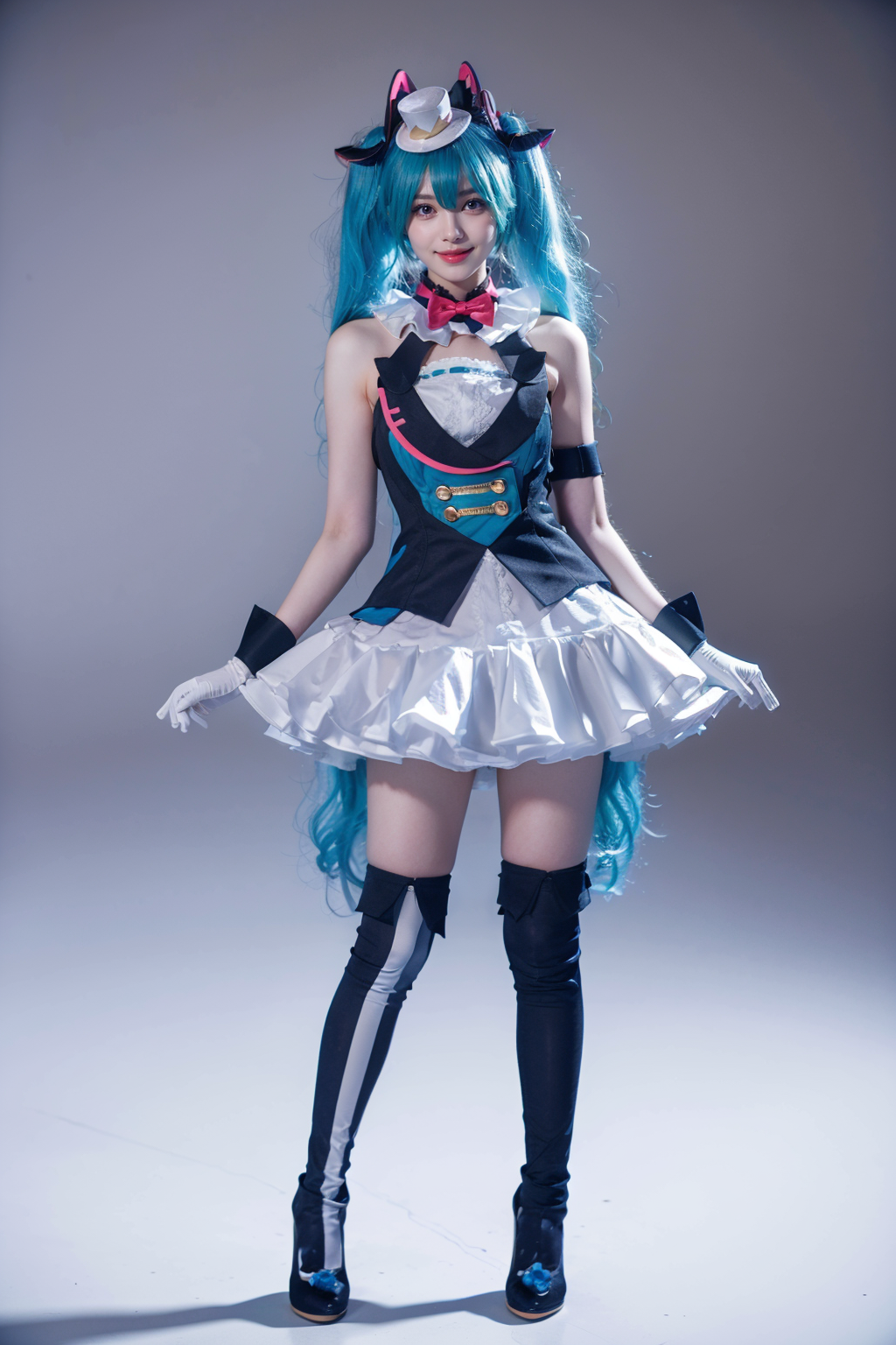 best quality, masterpiece, realistic, photorealistic, 1girl, solo, looking at viewer, smile, standing, full body, hatsune miku cosplay costume, hatsune miku, magical mirai miku, cosplay, aqua hair, twintails, very long hair, vest, sleeveless dress, frills, asymmetrical gloves, bowtie, mini hat, hair ornament, gloves, wrist cuffs, asymmetrical legwear, vertical-striped thighhighs, shoes, grey background, <lora:miku_cosplay_magicalMirai2019_v1:0.7>