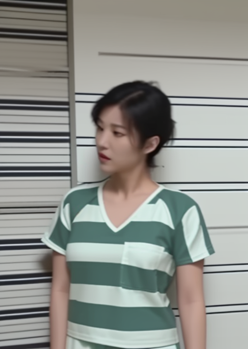 <lora:Striped_Prison_JumpsuitsScrubs:.7>, Asian woman, wearing an Green_White_Striped_Scrubs, short sleeve top, BREAK, prison cellblock background, dark, White colored background, cellblock