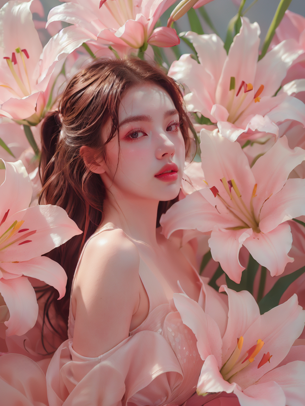 photography,(fashion photography:1.2),(half-body photo:1.1),(elegant and stylish model:1.1),(elegant and gentle:1.1), <lora:BHHç²é»_v1.0:0.77>,BHH,pink lily,blooming flowers,delicate buds,(pink atmosphere:1.1),soft natural light,whimsical,<lora:duobabaè²å½©çå¼¹:0.43>,