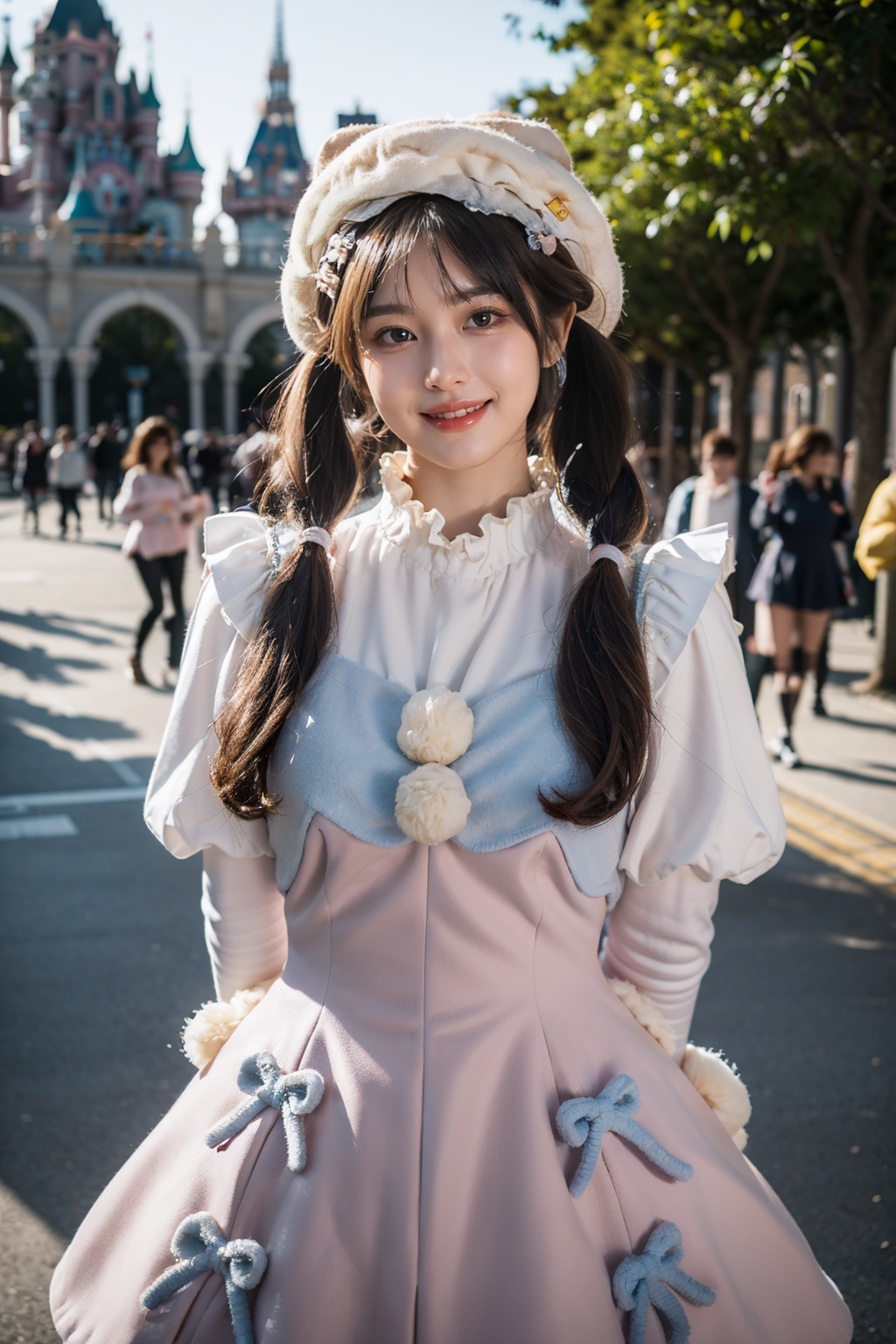 best quality, masterpiece, realistic, photorealistic, 1girl, solo, looking at viewer, smile, low twintails, bangs, standing, arms arms behind back, cowboy shot, cyb dress, pink dress, dress, pom pom, bow, long sleeves, puffy sleeves, hat, amusement park, people, detailed background, <lora:cute_attire_style2_v1:0.75>