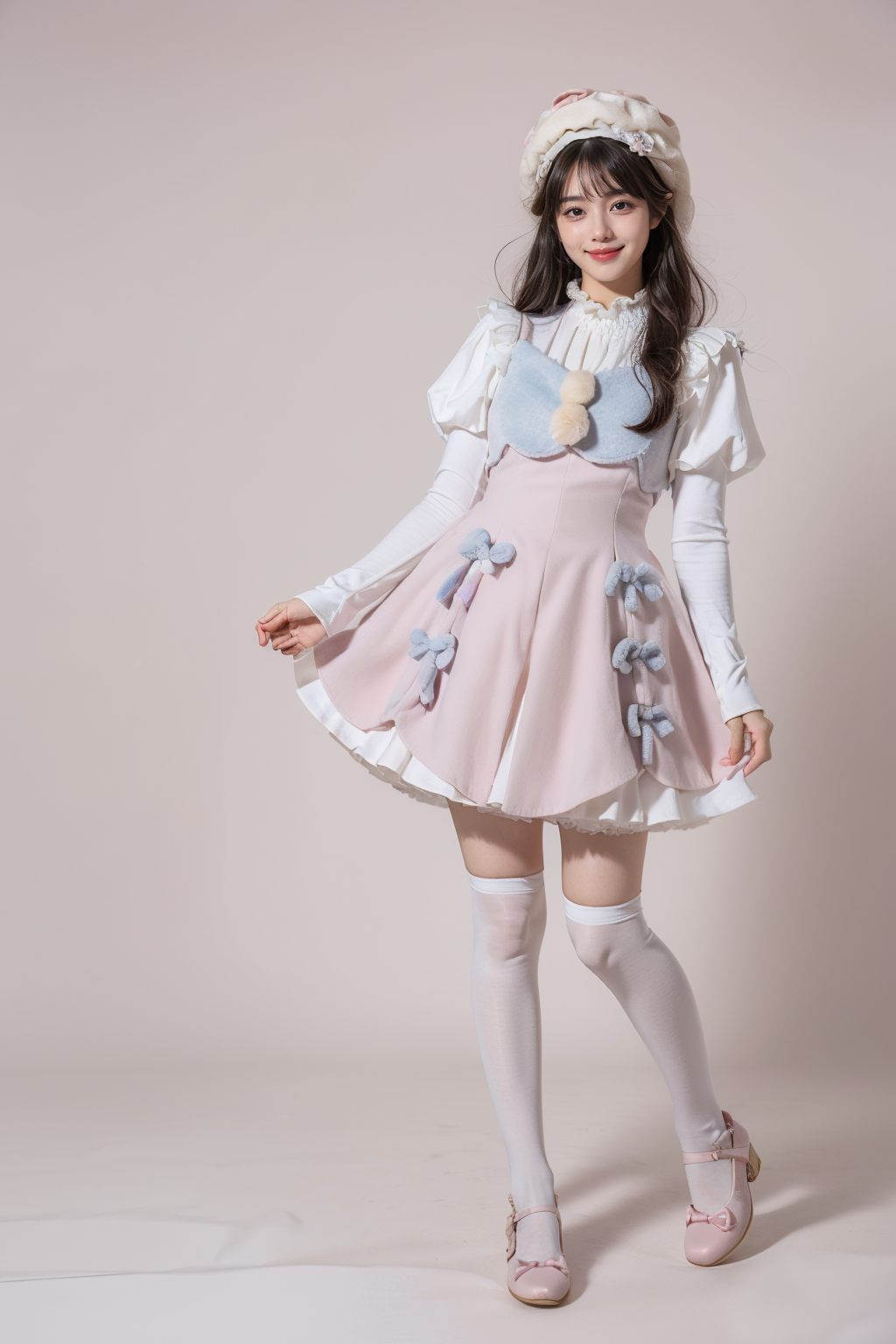 best quality, masterpiece, realistic, photorealistic, 1girl, solo, looking at viewer, smile, long black hair, bangs, standing, full body, cyb dress, pink dress, dress, pom pom, bow, long sleeves, puffy sleeves, hat, white thighhighs, pink shoes, simple background, pink background, <lora:cute_attire_style2_v1:0.75>