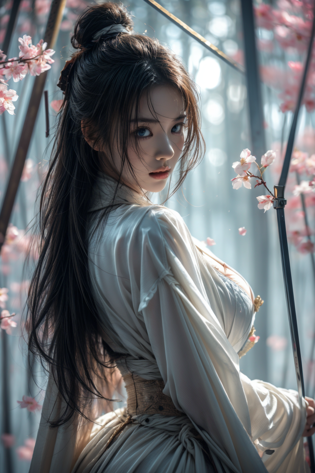 leogirl, seductive leaning forward detailed skin, ultra realistic cg, picture-perfect face, flawless, clean, masterpiece, professional artwork, famous artwork, cinematic lighting, white robesï¼ï¼Chinese style white robe Paired with lace edgesï¼0.8ï¼, in the forest, background blurred, cherry blossoms and fallen leaves,ï¼cinematic bloom,((black hair)),(1girl, beautiful korean girl),perfect face, (young:1.1),((fit figure)),((25 year old)), beautiful face, beautiful blue eyes,detail eyes, detail face, (((perfect female body, narrow waist))),(large breasts:1.3), ((girl standing)), upper body, blade to side, strike pose , blade down ,blade right hand, cherry blossoms, (masterpiece, best quality, high quality, highres, ultra-detailed), <lora:Sword Sakura:0.9>, <lora:0258 see-through nurse_v1:0.6> <lora:more_details:0.8> <lora:0242 prison bird_v1:0.5>