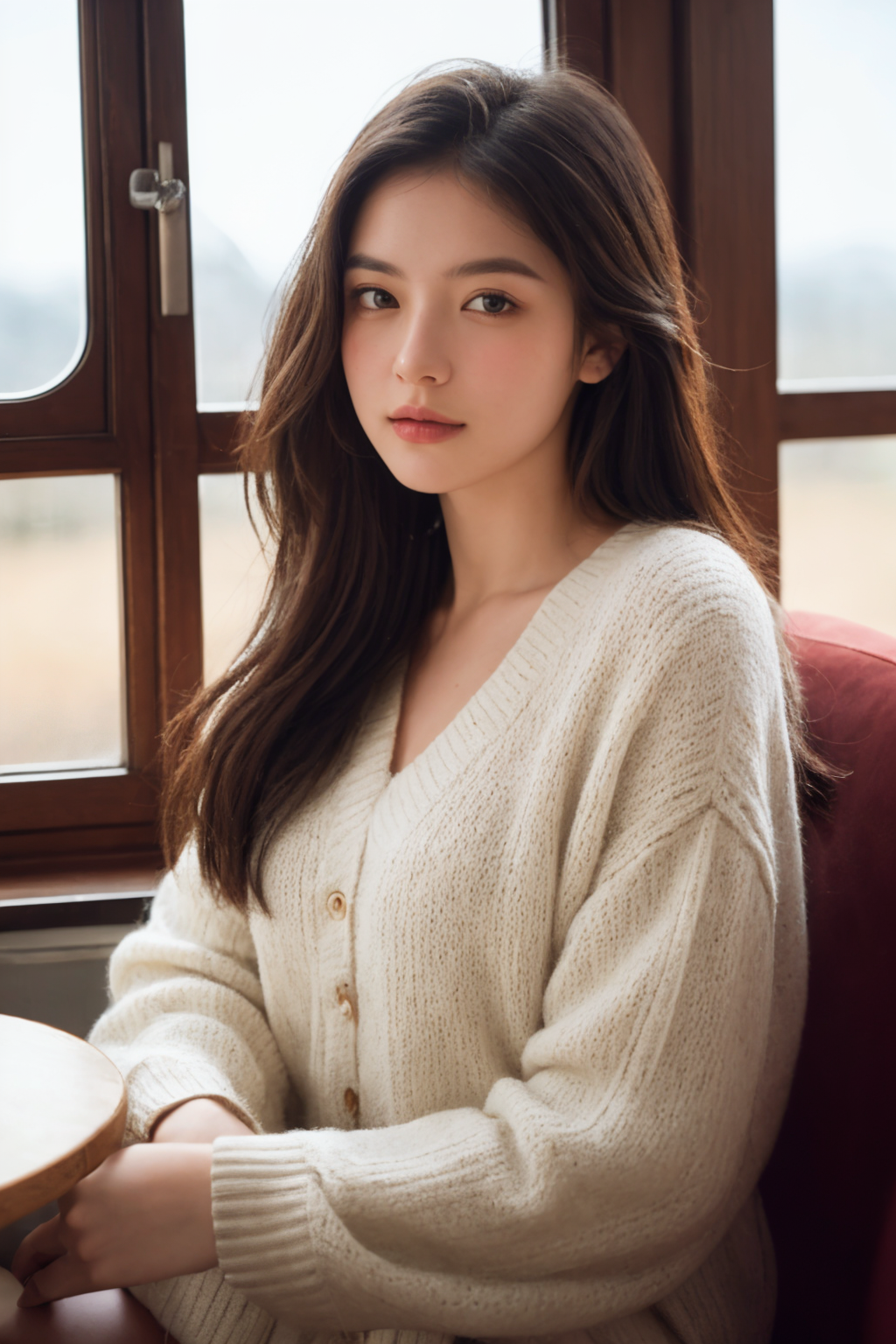 HDR photo of a detailed portrait of a young, beautiful Swedish woman seated in a cozy cafe, Nordic features, captivating eyes, and natural beauty, warm ambiance, soft lighting and subtle, inviting decor, tranquil backdrop, RAW photo, (high detailed skin:1.2), 8k UHD, DSLR, soft lighting, high quality, film grain, Fujifilm XT3, epiCPhoto, A style of drawing that uses a plain, neutral background to draw attention to the subject of the drawing . High dynamic range, vivid, rich details, clear shadows and highlights, realistic, intense, enhanced contrast, highly detailed