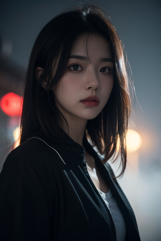 city street, neon, fog, volumetric, closeup portrait photo of young woman in dark clothes