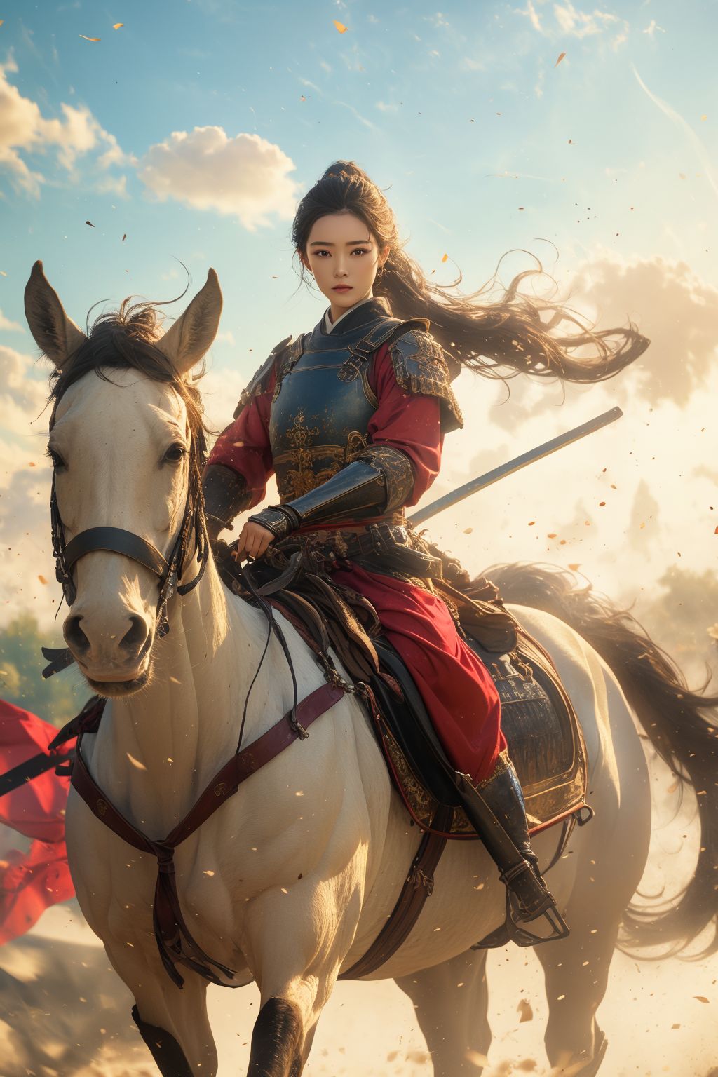 1girl,full body,(best quality, masterpiece:1.4),(realism:1.2),(realisitc:1.2),(absurdres:1.2),(photorealistic:1.3),Realistic Skin,Solo,an extremely delicate and beautiful,CG,unity,8k wallpaper,Amazing,official art,extremely detailed,incredibly,huge filesize,ultra-detailed,looking at viewer,<lora:Samurai:0.7>,<lora:niji_wushi:0.6>,full body,riding on a white horse, (masterpiece, best quality, high quality, highres, ultra-detailed),