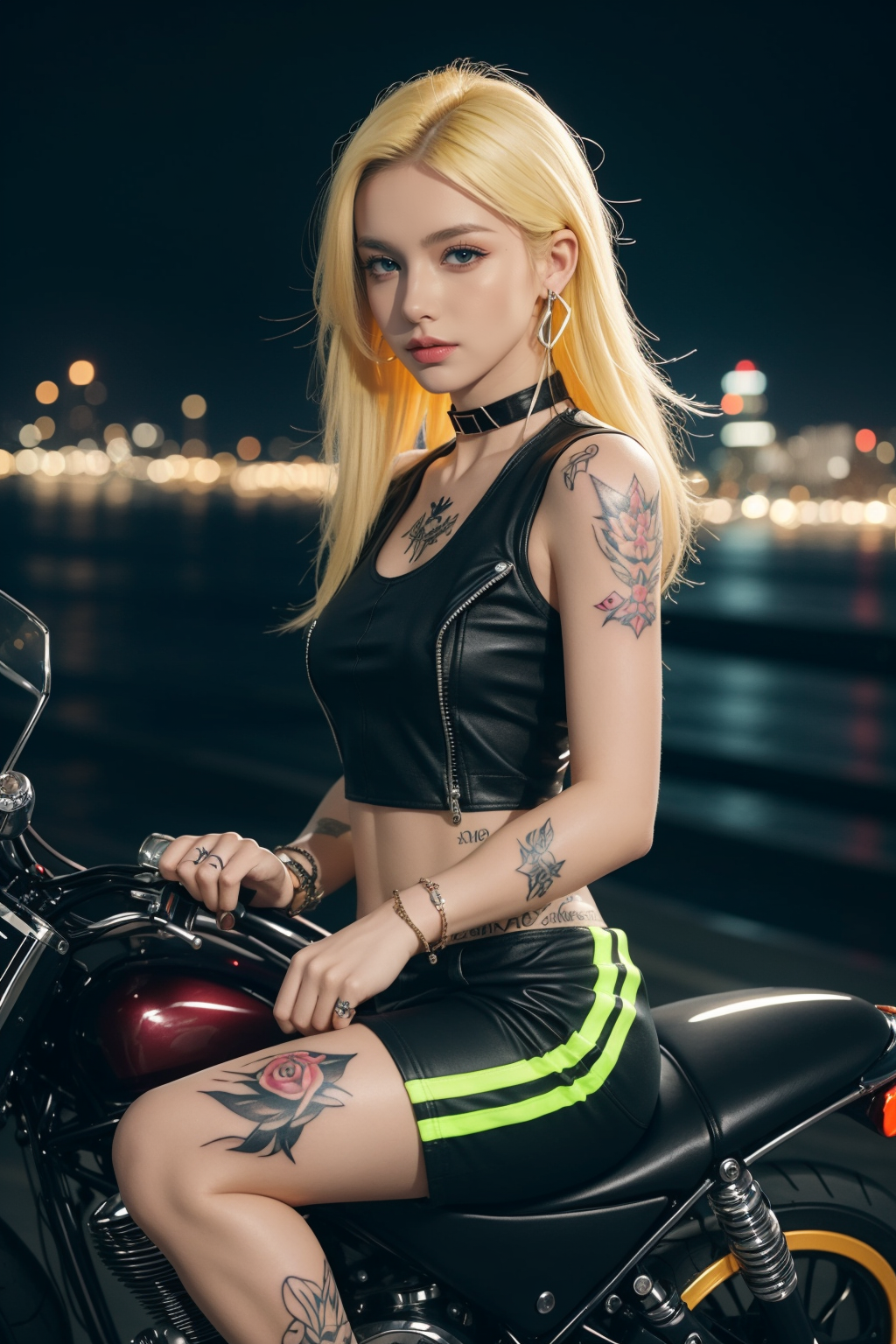 photo, a girl, sitting on a motorcycle, chopper, night, rain, neon lights, biker clothes, sleeveless, pretty face, bright makeup, tattoos, face piercing, blonde hair, choker, small breasts, arm bracelets, night city background, (detailed:1.2), (sharp:1.2), (HDR:1.2), (good quality:1.2), (good resolution:1.2), maximalist, (masterpiece:1.2), photo, realistic, intricate, raw photo