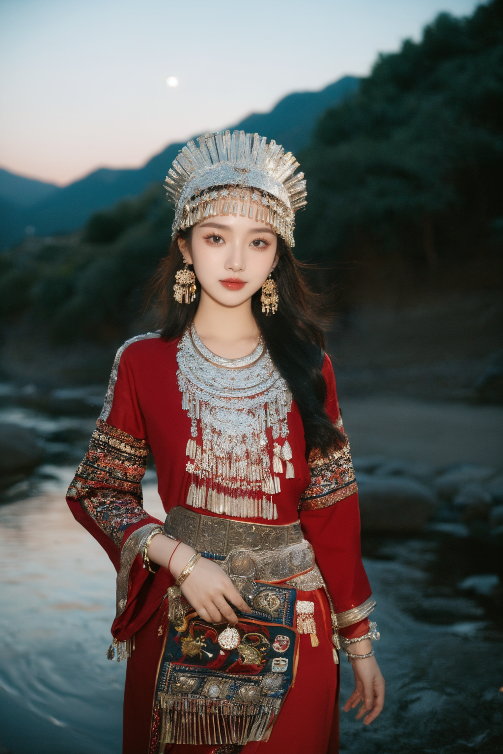 miaoyuansu, starry sky, fireworks, moon, firefly, (masterpiece, top quality, best quality, official art, beautiful and aesthetic:1.2),cinematic light, Dynamic Angle, Perspective, High Point, high resolution,unity 8k wallpaper, highest detailed,wonder,outline,intricate details,((wallpaper)),photorealistic, realistic, motion blur, 1girl, solo, skinny, <lora:åç:0.1> <lora:miaoyuansu-000010:0.85> (black:1.2) looking at viewer, long hair, brown eyes, hat, hair ornament, hair ribbon, headgear,earrings, necklace, bracelet, long sleeves, traditional clothes, makeup, jewelry, tassel, gem, cowboy shot, colorful, On a secluded path in the Miao village, a Miao girl in simple ethnic attire accentuates her alluring curves under the play of light and shadow. Her ample bust and pert derriere are subtly revealed, exuding an irresistible temptation. Her eyes are deep and flirtatious, with a challenging smile on her lips, as if testing the viewer's self-control. The natural light and shadow intermingle with the colors on her body, creating a mysterious and seductive atmosphere that invites further exploration <lora:epiNoiseoffset_v2:0.3> <lora:neg4all_bdsqlsz_V3.5:0.3>