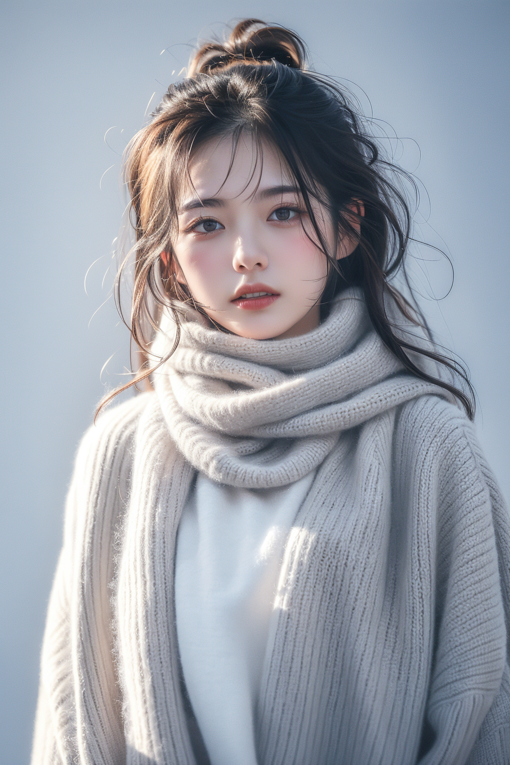The image features a woman with long,curly hair,relaxed,wearing a white shirt and a scarf. She is looking at the camera,giving off a warm and friendly vibe. The woman's hair is blowing in the wind,adding a sense of movement and liveliness to the scene. The combination of her outfit,the scarf,and the windy conditions creates a visually appealing and dynamic image. High fashion,pure gray background,dynamic,dramatic,elegant,<lora:è¸æ±½_æ¾å¼æ:1>,