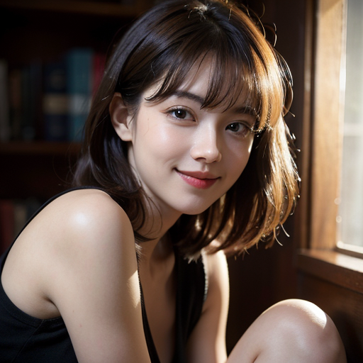 (RAW photo, best quality), (realistic, photo-realistic:1.3), masterpiece, an extremely delicate and beautiful, extremely detailed, CG, unity, 8k, amazing, finely detail, ultra-detailed, highres, absurdres, soft light, (black hair, short hair, curly hair, messy hair, bangs), beautiful detailed girl, detailed fingers, extremely detailed eyes and face, beautiful detailed nose, beautiful detailed eyes, (light on face), looking at viewer, (closed mouth:1.2), 1girl, cute, young, mature face, pale skin, (half body:1.3, sitting), (medium breasts), realistic face, realistic body, beautiful detailed thigh, (ulzzang-6500-v1.1:0.6), <lora:koreanDollLikeness_v15:0.5>, black shirt, <lora:kaomingStyleLora_kaomingStyleV1:0.6>, (semi smile:1.3),