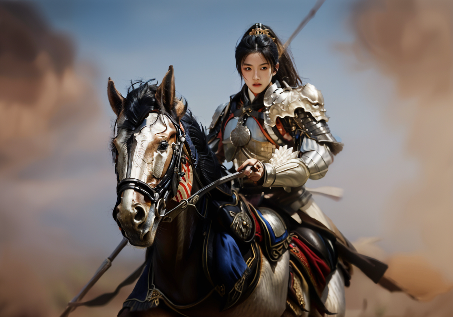 Chinese_armor,a 25 year old chinese girl,Women's armor,solo,shoulder_armor,helmet,Running warhorse,Riding a warhorse,Holding weapon,blue_sky,detailed_eyes,looking at viewer,outdoors,black hair,masterpiece, best quality, perfect eyes, perfect face, perfect lighting, 8K,perfect anatomy, <lora:ä¸å½ç²è-æ-å±±æç²ï¼Chinese_armor,Ming,Mountain Pattern Armorï¼v1.0:0.8>