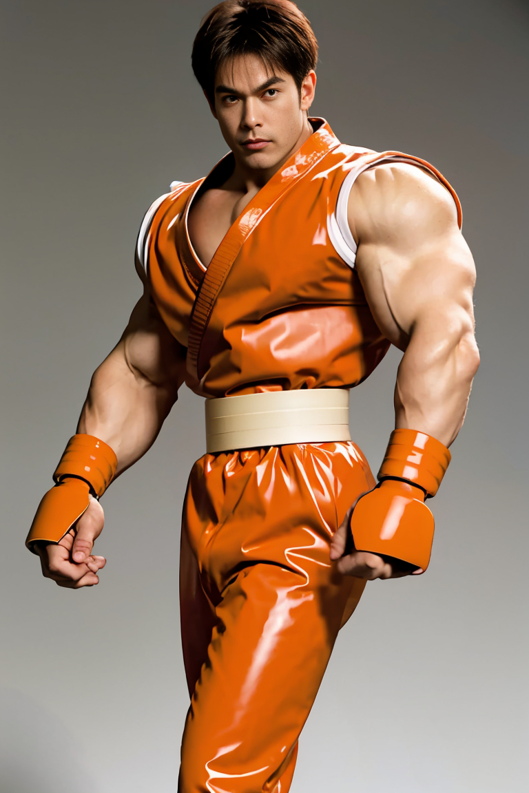 (masterpiece, best quality), 1boy, brown hair, looking at viewer, , huge male breasts, <lora:ShinkiroStyle:0.4> shinkiro style, t, white shiny latex narrow waist, v-shaped eyebrows, , crotch bulge, detailed eyes, belt } bulgej8 <lora:bulgeJ8_concept_V1:1> <lora:GuyFinalFight-DocStasis:1>orange dougi, ffguy,
