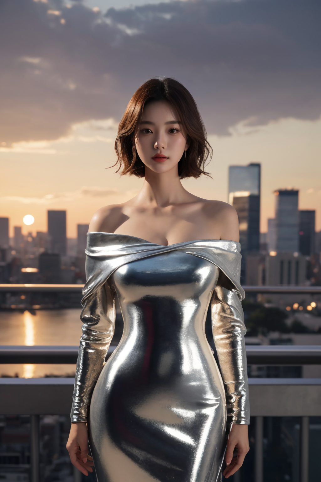<lora:m3t4ldr3ss:0.7>, m3t4ldr3ss, long sleeves, chrome dress, off shoulder, bare shoulders, best quality, masterpiece, illustration, realistic, photo-realistic, amazing, finely detail, incredibly absurdres, huge filesize, ultra-detailed, highres, extremely detailed CG unity 8k wallpaper, nsfw, A beautiful Korean woman in her early 20s is wearing a long-sleeved, chrome dress with off-the-shoulder sleeves. The dress is made of a shiny, metallic fabric that hugs her curves perfectly. Her hair is styled in a soft, wavy bob, and her makeup is natural and understated. She is standing in front of a futuristic city skyline. The city is bathed in the glow of the setting sun, and the lights of the buildings twinkle in the distance. The camera is zoomed in close to her face, and the lighting is soft and flattering. The overall effect is elegant and sophisticated.