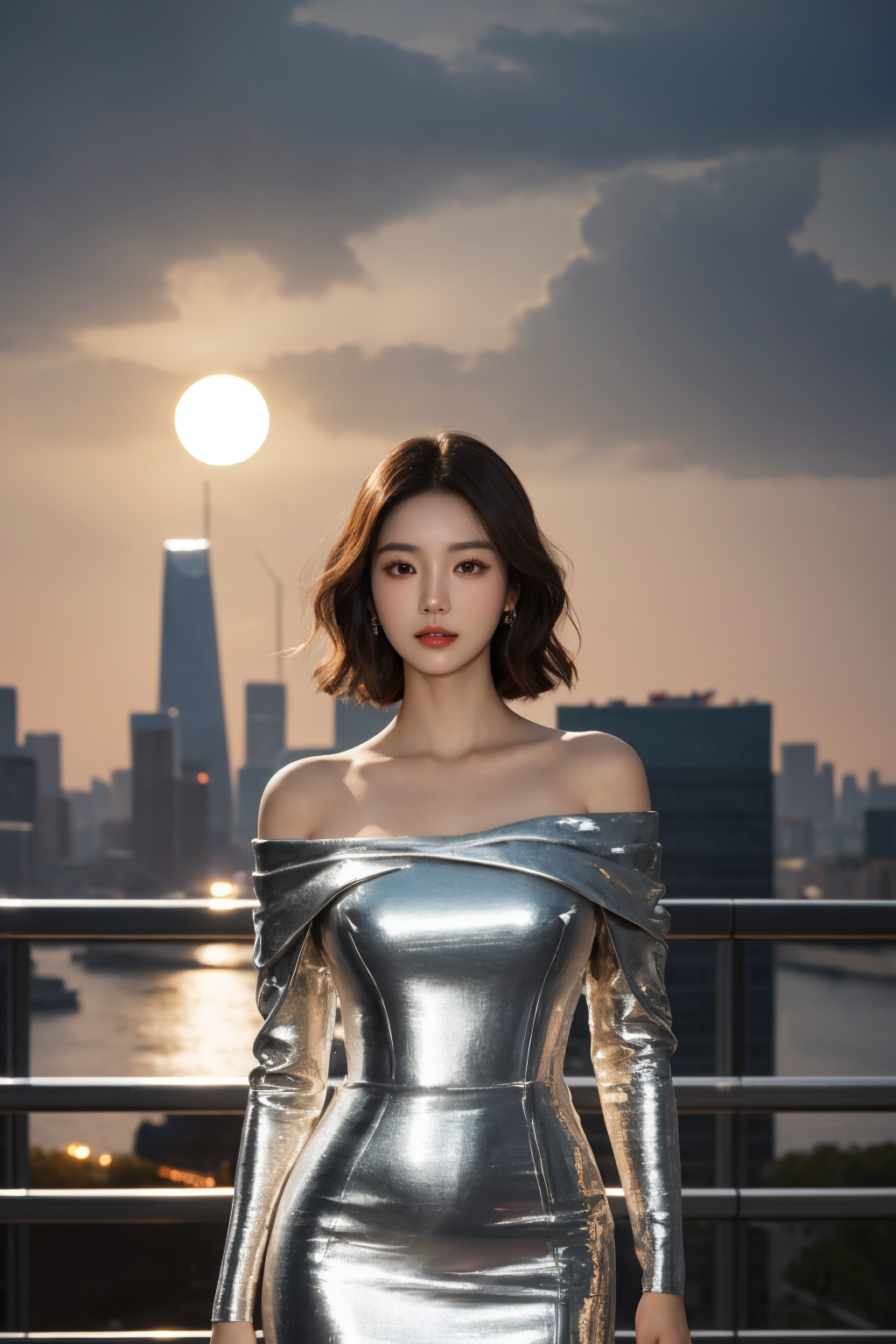 <lora:m3t4ldr3ss:0.7>, m3t4ldr3ss, long sleeves, chrome dress, off shoulder, bare shoulders, best quality, masterpiece, illustration, realistic, photo-realistic, amazing, finely detail, incredibly absurdres, huge filesize, ultra-detailed, highres, extremely detailed CG unity 8k wallpaper, nsfw, A beautiful Korean woman in her early 20s is wearing a long-sleeved, chrome dress with off-the-shoulder sleeves. The dress is made of a shiny, metallic fabric that hugs her curves perfectly. Her hair is styled in a soft, wavy bob, and her makeup is natural and understated. She is standing in front of a futuristic city skyline. The city is bathed in the glow of the setting sun, and the lights of the buildings twinkle in the distance. The camera is zoomed in close to her face, and the lighting is soft and flattering. The overall effect is elegant and sophisticated.