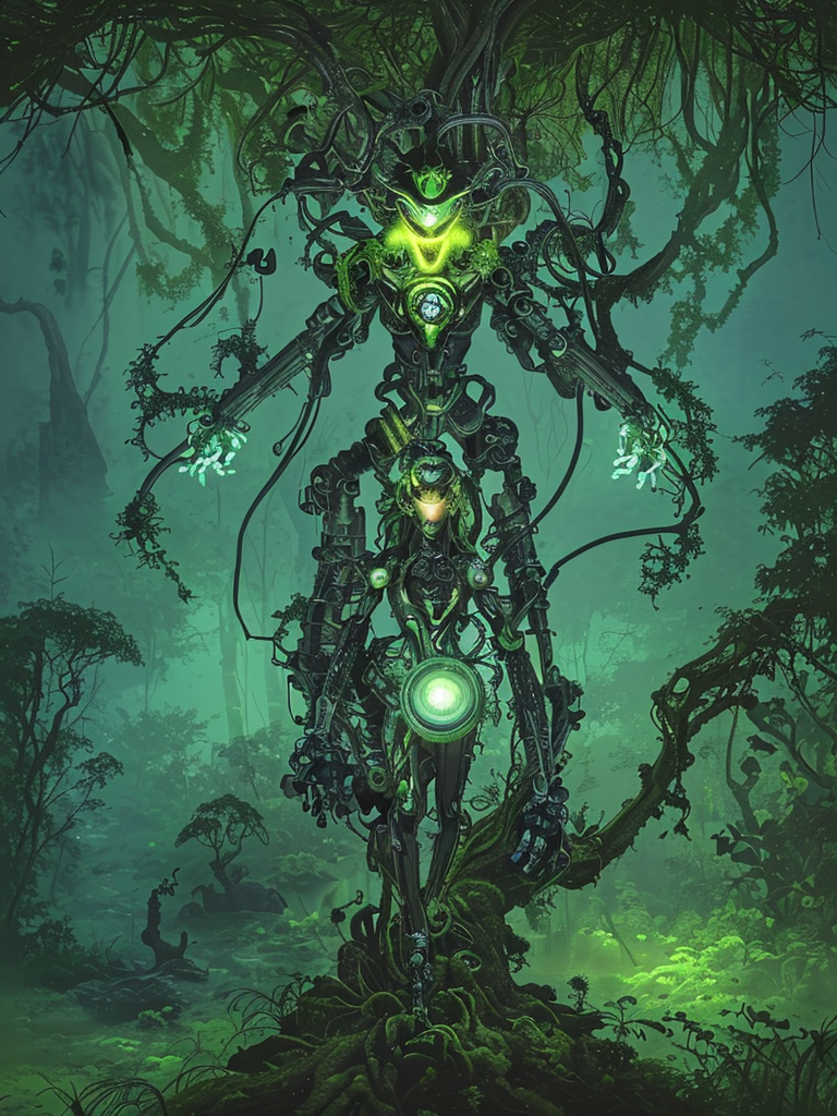 illustration-style picture of a biomechanical entity. The entity is a fusion of technology and nature, with a helmet that resembles a diving suit, its surface covered in verdant moss, handing a flower to viewer, twisting vines, and bright, exotic flowers. Its arms are heavy and robotic, adorned with peaceful symbols and patterns. The backdrop is an enchanted swamp, filled with a mystical fog, gnarly trees, and a spectrum of swamp flora. Fireflies dot the air with their luminescent glow. The illustration should have a whimsical and fantastical feel, with vibrant colors and a hand-drawn quality that emphasizes the enchanting aspects of the scene and the organic-meets-mechanical theme.