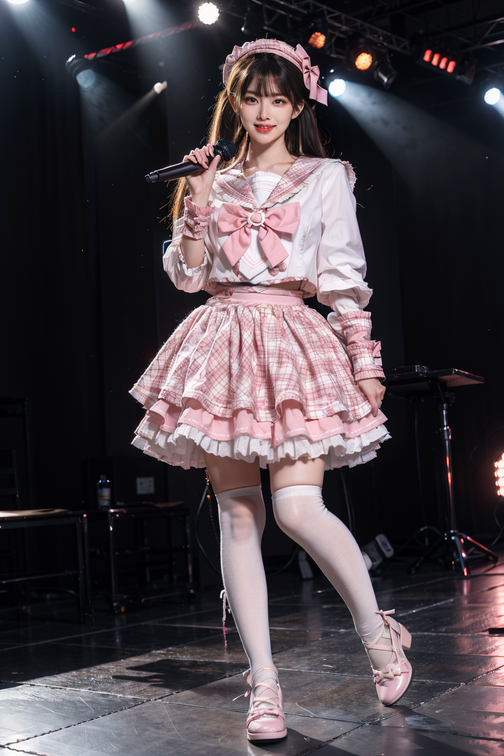 best quality, masterpiece, realistic, photorealistic, 1girl, solo, smile, full body, standing, low twintails, bangs, smile, idol costume, cyb skirt, cyb shirt, plaid skirt, frilled skirt, idol, wrist cuffs, bow, sailor collar, frills, holding microphone, white thighhighs, shoes, stage in the backgorund, stage lighting, stage spotlight, audience, people, <lora:idol_costume_style7_v1:0.7>