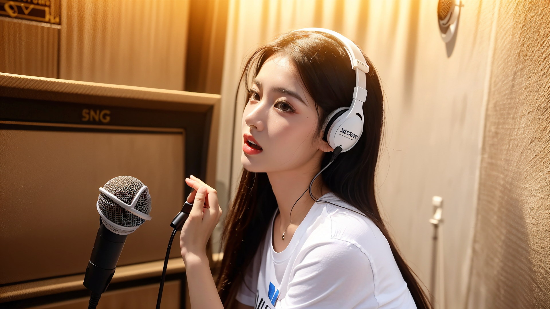 Chelsea from Mozambique, (1girl:2.3),slender face,slender_waist,(recording studio:1.3),(recording booth:1.9),japanese idol,age 17,japanese,(photos of one person:2.2),lens_flare,(very big breast:1.3),applying_makeup,standing,tight skirt,from_side,(cowboy shot:1.5),(sang alone:2),(both hands are applied to the waist:1.5),(monitor headphone:1.4),(white_shirt:1.1),(close-up:1.4),(face_focus:1.2),(very small booth:1.4),(mic stand:1.3),