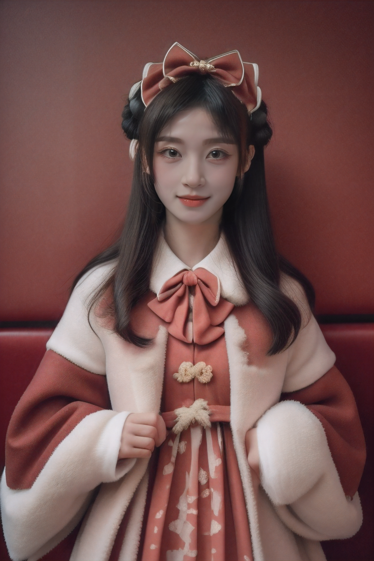 best quality, masterpiece, Highly detailed, extreme detail description, Professional, 1girl, <lora:neg4all_bdsqlsz_V3.5:1>, photo \(medium\), <lora:PAseer-SD15-LCM Quick:1>, <lora:ip-adapter-faceid-plusv2_sd15_lora:1>, <lora:chinese_new_year_dress_style1_v1:1:lbw=CLOTH>, cyb dress, layered dress, long sleeves, hair bow, frilled dress, overcoat, bowtie,