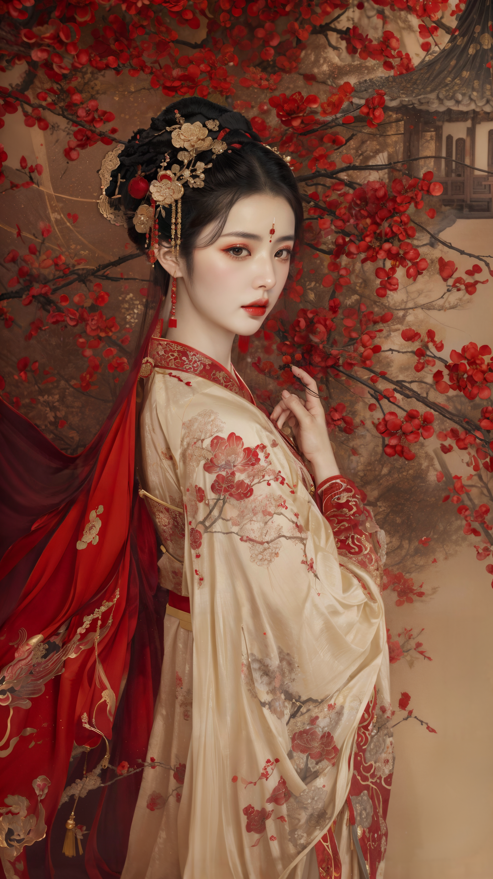 <lora:GoodHands-beta2:1>,masterpiece,ultra_detailed,highres,absurdres:1.2,photo realistic,best quality,highly detailed,photography,8K,HDR,arafed woman in a red and gold dress and a red flowered tree,jingna zhang,palace,a girl in hanfu,by Lü Ji,chinese style painting,by Tang Di,by Yun Shouping,by WLOP,chinese painting,beautiful render of tang dynasty,beautiful oriental woman,takato yamamoto aesthetic,chinese art,<lora:add_detail:0.4>,<lora:more_details:0.4>,<lora:anxiang:0.2>,