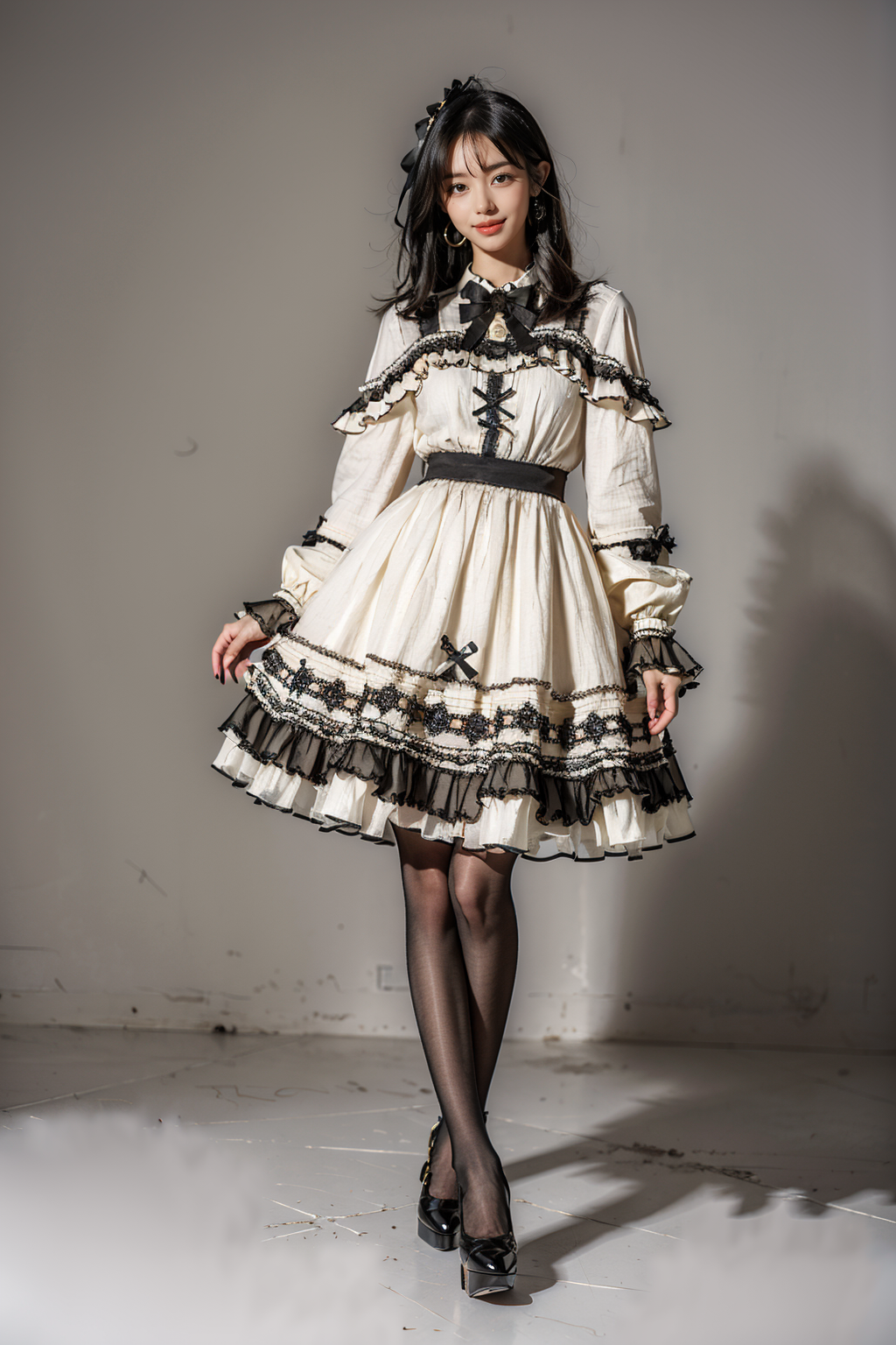 best quality, masterpiece, photorealistic, realistic, 1girl, solo, long black hair, straight hair, bangs, looking at viewer, smile, full body, standing, cyb dress, frills, frilled dress, long sleeves, bow, lace, white pantyhose, high heels, simple background, <lora:lo_dress_vol2_style8_v1:0.7>