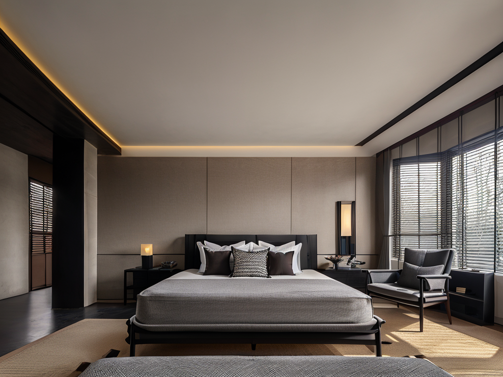 Lao Chen, Lao Chen, bedroom, dark color, bed, carpet, chairs, windows, ceiling of the best quality, masterpiece, high quality, realistic, realistic, super detailed, full detail, 8K,