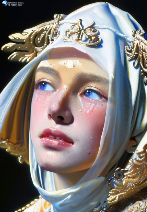 ((masterpiece:1.2, best quality)), ultra detailed, high resolution, Ultra-precise depiction, Ultra-detailed depiction, best quality, extremely detailed,(photorealistic:1.4), official art, unity 8k wallpaper, beautiful and aesthetic,deep shadow, low key, official art, unity 8k wallpaper, (masterpiece),(intricate details),(raw photo,8k,photorealistic:1.3),Fujifilm XT3, sharp focus, (highly detailed background:1.0), ultra realistic details, sharp focus, (original: 1.2), (gold:1.4), white linen cap, painting, (sad face),(tears) oil painting,((looking up)), portrait,((close up)),a woman with a gold crown and a veil, criying, looking up, trending on artstation hq, concept art, fantasy art <lora:add_detail:0.4> <lora:vermeer:0.8>