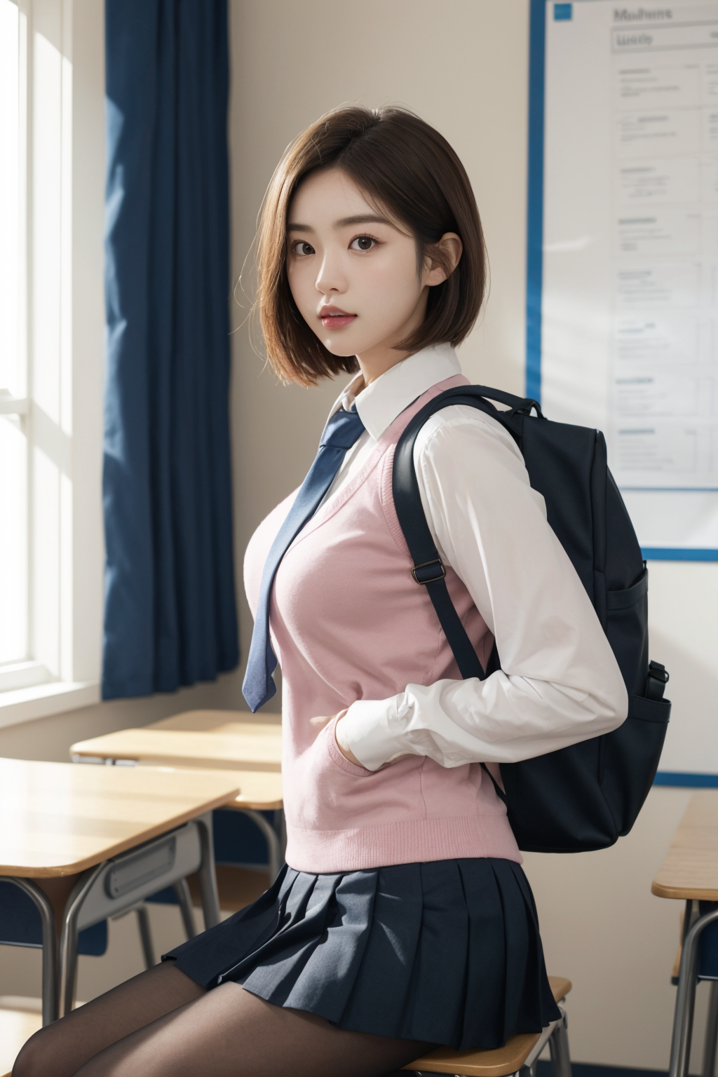 <lora:Pink_Purple_School_Dress_By_Stable_Yogi:0.8>, best quality, masterpiece, illustration, realistic, photo-realistic, amazing, finely detail, incredibly absurdres, huge filesize, ultra-detailed, highres, extremely detailed CG unity 8k wallpaper, nsfw, A cute young woman with Korean-style facial features resembling a popular actress is sitting in a classroom. She has short hair and is wearing light makeup. She is wearing a school uniform, consisting of a pink vest, a white collared shirt with long sleeves, a pleated skirt, and pantyhose. She is also wearing a necktie and a backpack. The scene is set in a well-lit classroom, and the photo is taken from a candid perspective, similar to one taken with a high-end DSLR camera with depth of field.