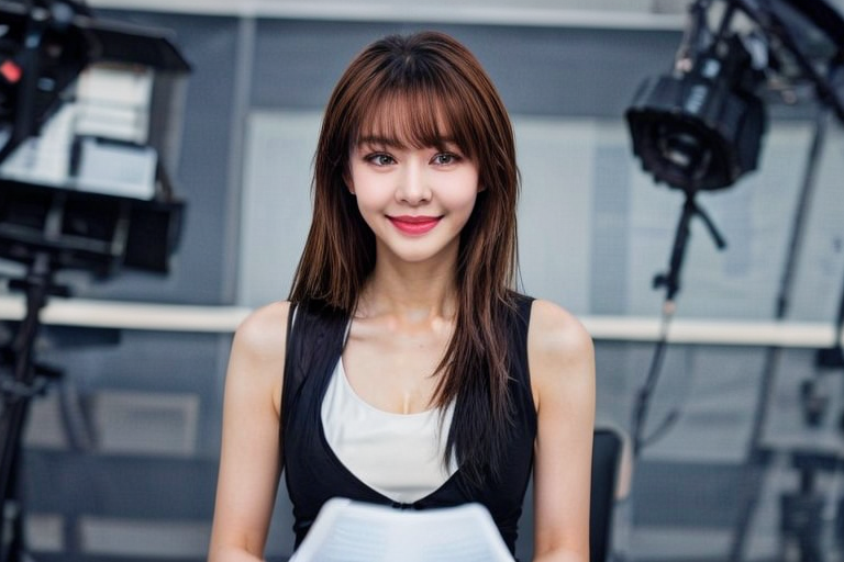 nice hand,perfect hand, <lora:GoodHands-beta2:1> YURICHEN,<lora:YURI:0.8>,1girl,long hair,solo,(light smile),(news anchor:1.5),(sitting Chair),realistic,medium breasts, best quality,masterpiece,illustration,an extremely delicate and beautiful,CG,unity,8k wallpaper,Amazing,finely detail,masterpiece,official art,extremely detailed CG unity 8k wallpaper,incredibly absurdres,huge filesize,ultra-detailed,highres,extremely detailed,beautiful detailed girl,realistic,full frontal,light contrast,blurry, <lora:LCM-LoRA_sd15:1>, <lora:add_detail:0.7>