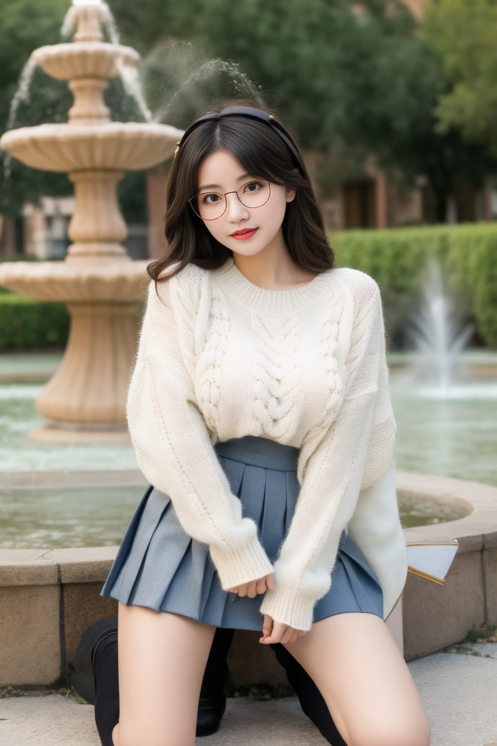 best quality,master piece, <lora:hreg:0.7>,1girl,glasses,large_breast,cowboy_shot, Oversized sweater,Pleated mini skirt,Over-the-knee socks,Mary Jane shoes,and cute hair clips., Quaint village square with a charming fountain,