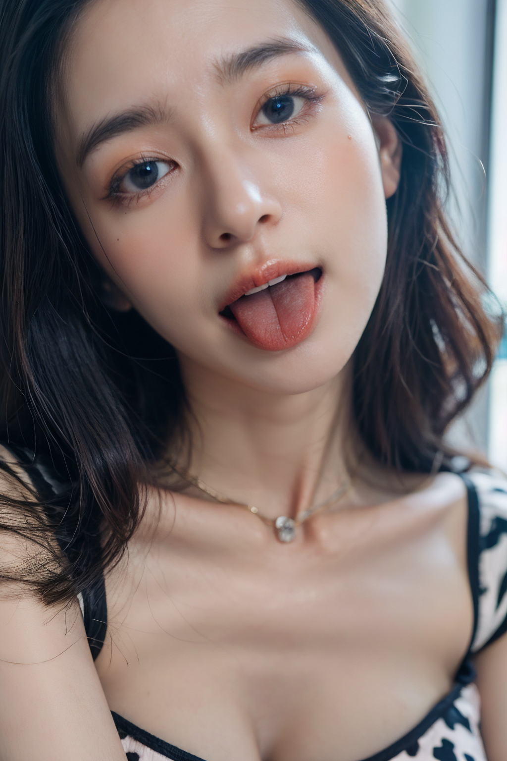 highres, 8k, absurdres, realistic, CN Girl6, 1girl, (black hair), (looking at viewer), ((long hair)), medium breasts, ((blue eyes)), ((close up)), <lora:Stunning Beauty - 002:0.5>, (tongue:1.4), (tongue out:1.4), open mouth, sexually suggestive, <lora:CowPrint_Maid_Outfit:0.8> 1girl, cow print, bikini, bra, bare arms, neck ribbon, (waist apron), thongs, bare legs,