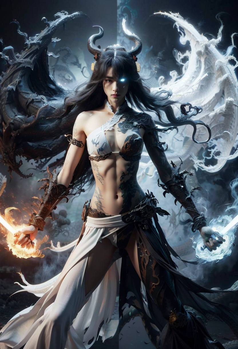 white sword, black sword, glowing weapon, dual wielding, yin yang, keleton,moster,ghost,horn, hell, fighting stance, dual wielding, dragon, fire, wabstyle, glowing, two-tone hair, (1girl:1.3,nude:1.4, topless:1.3), large breasts, long hair, sexy, solo, (photorealistic:1.4), cowboy shot, motion blur, looking at viewer, <lora:wabstyle:0.7>