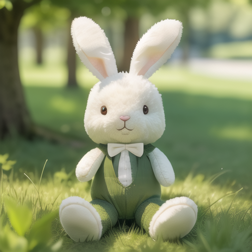 <lora:stuffed_toy1.5v1.2:1>stuffed toy, no humans, rabbit, blurry, solo, outdoors, sitting, plant, looking at viewer, grass, nature, blurry background, day, black eyes, depth of field, full body, tree