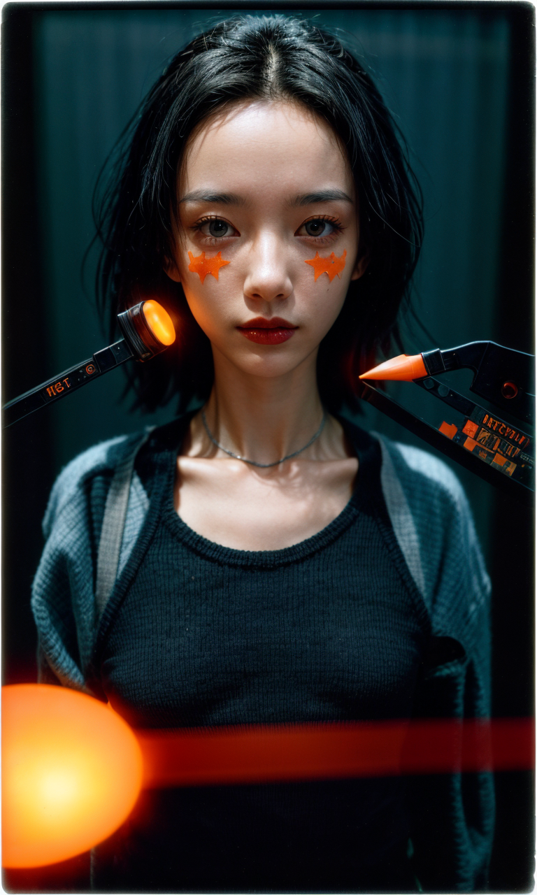 (1girl:0.8),lonely museum curator in eerie key light, surrounded by cinestill-inspired electric color flakes, hyperpunk scene with desaturated dark (orange:0.8) and black details, colorful polaroid with vibrant colors, (vacations, high resolution:1.2), (small, selective focus, surreal film:1.2)