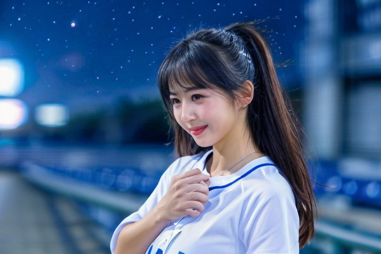 nice hand,perfect hand, <lora:GoodHands-beta2:1> PENGJOYCE ,<lora:joyce:0.7>,glowing eyes,1girl,long hair,(WHITE BASEBALL cheerleader uniform),solo,baseball stadium,(night sky:1.3),SMILE,realistic,medium breasts,best quality,masterpiece,an extremely delicate and beautiful,CG,unity,8k wallpaper,Amazing,finely detail,masterpiece,official art,extremely detailed CG unity 8k wallpaper,incredibly absurdres,huge filesize,ultra-detailed,highres,extremely detailed,beautiful detailed girl,realistic,full frontal,light contrast,<lora:LCM-LoRA_sd15:1>, <lora:add_detail:0.5>