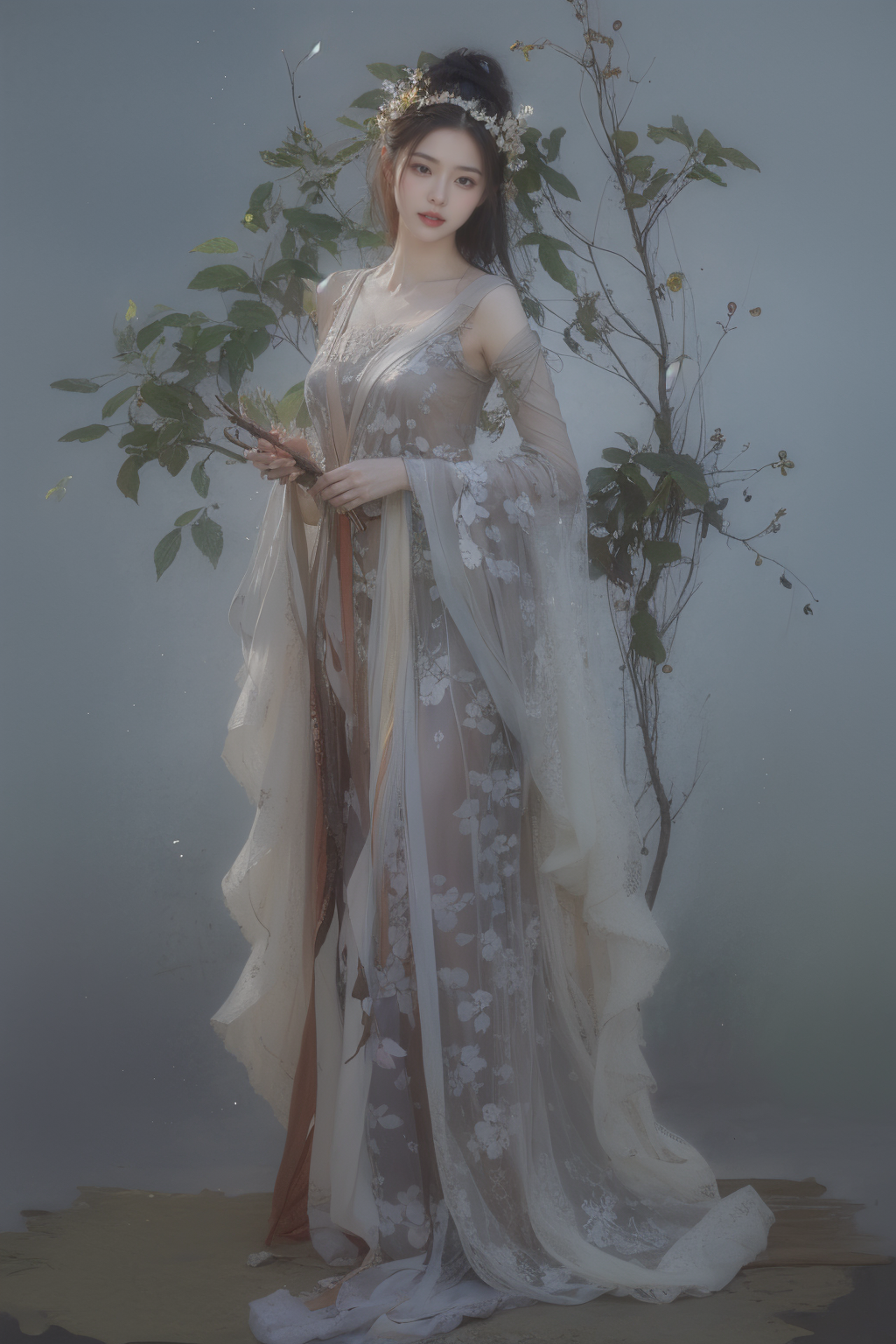 (1girl:1.2),{extremely delicate},large file,high details,long hair,mirage,medium view,bokeh,beautiful face,expressive oil paintings,(gongbi painting work),hair and body gradually grow leaves and withered branches and wrap it on the body,cowboy_shot,<lora:zhongfenghuaStyle_v10:0.4>,<lora:qianjinghui:0.4>,<lora:faguang:0.6>,grace,temperament,<lora:LowRA:0.4>,