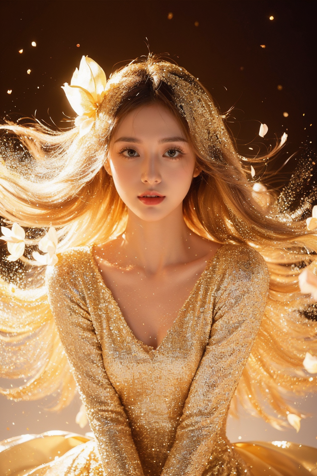(1girl:1.1),stars in the eyes,(pure girl:1.1),(full body:0.6),There are many scattered luminous petals,contour deepening,white_background,cinematic angle,gold powder,<lora:jin_20231226224140-000003:0.7>,