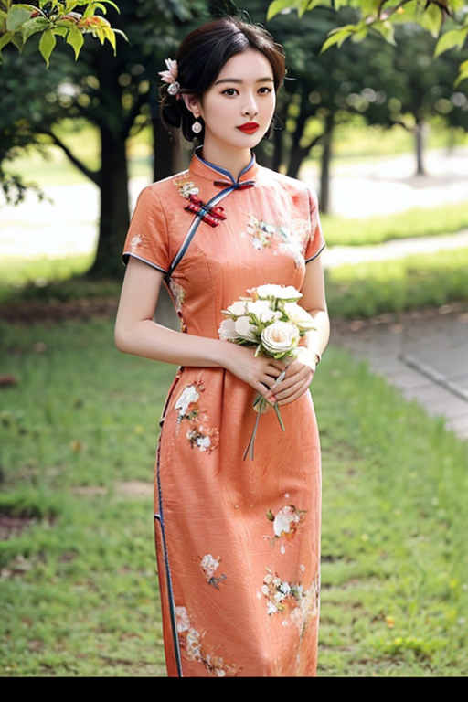 (masterpiece:1.2), best quality, masterpiece, highres, original,perfect light, 4k,8k,1girl, black hair, blurry background, bouquet, china dress, chinese clothes, day, depth of field, dress, earrings, floral print, flower, garden, holding, jewelry, lips, lipstick, makeup, nature, outdoors, realistic, red lips, short hair, solo, standing, tree, white dress, <lora:æè¢:0.7>
