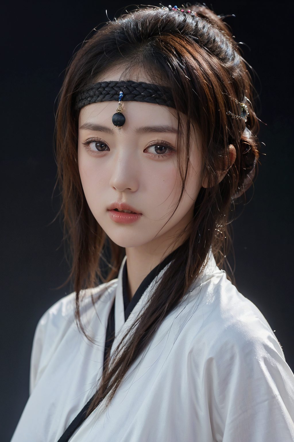 <lora:nvshenlongv2:0.7>,nvshenlong,shangguanyan,Headwear,Black braided headband,The black stone hung on the forehead,1girl,solo,dress,black hair,white dress,hair bun,single hair bun,looking at viewer,lips,brown hair,chinese clothes,Black background,Background of Chinese calligraphy,portrait,absurdres,, (masterpiece:1.2), best quality, highres,extremely detailed CG,perfect lighting,8k wallpaper,photograph, photorealistic,, best quality , masterpiece, illustration, an extremely delicate and beautiful, extremely detailed ,CG,unity,8k wallpaper, Amazing, finely detail, masterpiece, best quality,official art,extremely detailed CG unity 8k wallpaper,absurdres, incredibly absurdres, huge filesize , ultra-detailed, highres, extremely detailed,beautiful detailed girl, extremely detailed eyes and face, beautiful detailed eyes,light on face,