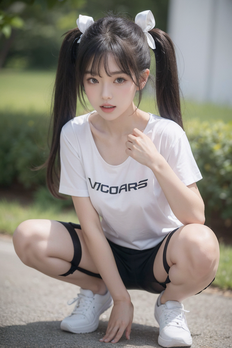 1girl, casual clothes, t-shirt, white shirt, twintails, long hair, black hair, hair ribbon, bangs, hair between eyes, squatting, outdoors, black shorts, looking at viewer, short sleeves, open mouth, hand up, medium breasts, collarbone, thighs, sneakers, day, plant, black ribbon, white footwear, full body, blush, sidelocks, bare legs