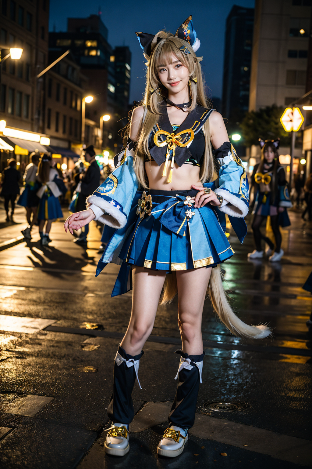 best quality, masterpiece, photorealistic, 1girl, solo, standing, full body, (looking at viewer:1.2), closed mouth, smile, kirara cosplay costume, kirara, cosplay, blonde hair, long hair, hair ornament, sailor collar, crop top, detached sleeves, skirt, cat ears, cat tail, animal ears, leg warmers, fur-trimmed shoes, <lora:genshin_Kirara_cosplay_v1:0.7>
