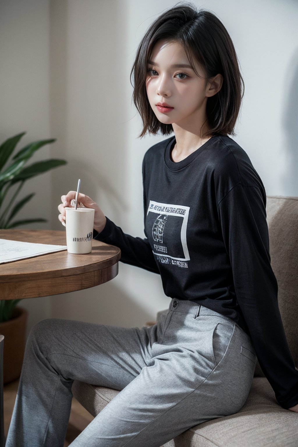 (photorealistic:1.4), raw photo, best quality, masterpiece, ultra high res,1girl,kimminjeong,detailed face,detailed eyes, (short black hair:1.1),small breast, long sleeve t-shirt,casual pants,sit at table,minimalist living room, (night0.1),<lora:add_detail:0.6> <lora:Winter_v1.1:1:lbw=FACE>