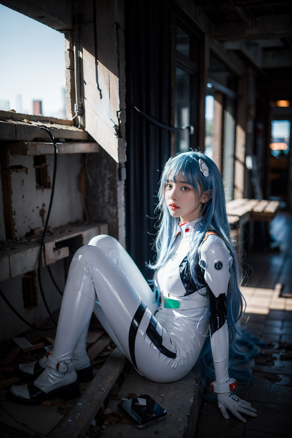 best quality, masterpiece, photorealistic, 1girl, solo, looking at viewer, bangs, full body, closed mouth, expressionless, ayanami_cosplay_costume, plugsuit, blue hair, ayanami rei, pilot suit, cosplay, long hair, interface headset, hairpods, gloves, bracer, skin tight, ( ruins:1.4), night, neon light, cyberpunk, science fiction, future city, detailed background, <lora:ayanami_cosplay_costume_v2:0.65>