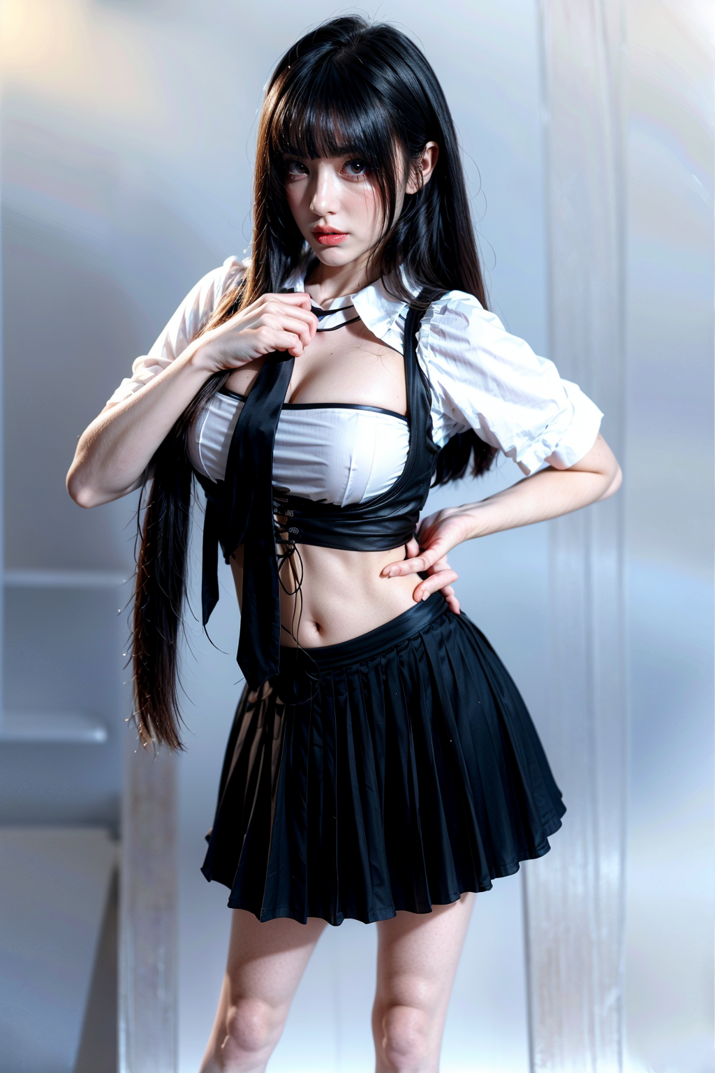 realistic,(best quality:1.3, high quality:1.3),8K Ultra HD,(ultra detailed, hyper detailed),surdres:1.2,masterpiece,(makeup:0.7, sexy, best body),1girl,solo,small head,full body,long hair,<lora:add_detail:1>,exposed waist,black necktie,black skirt,cleavage,<lora:combat uniform_20231220215731:1>,huge filesize,
