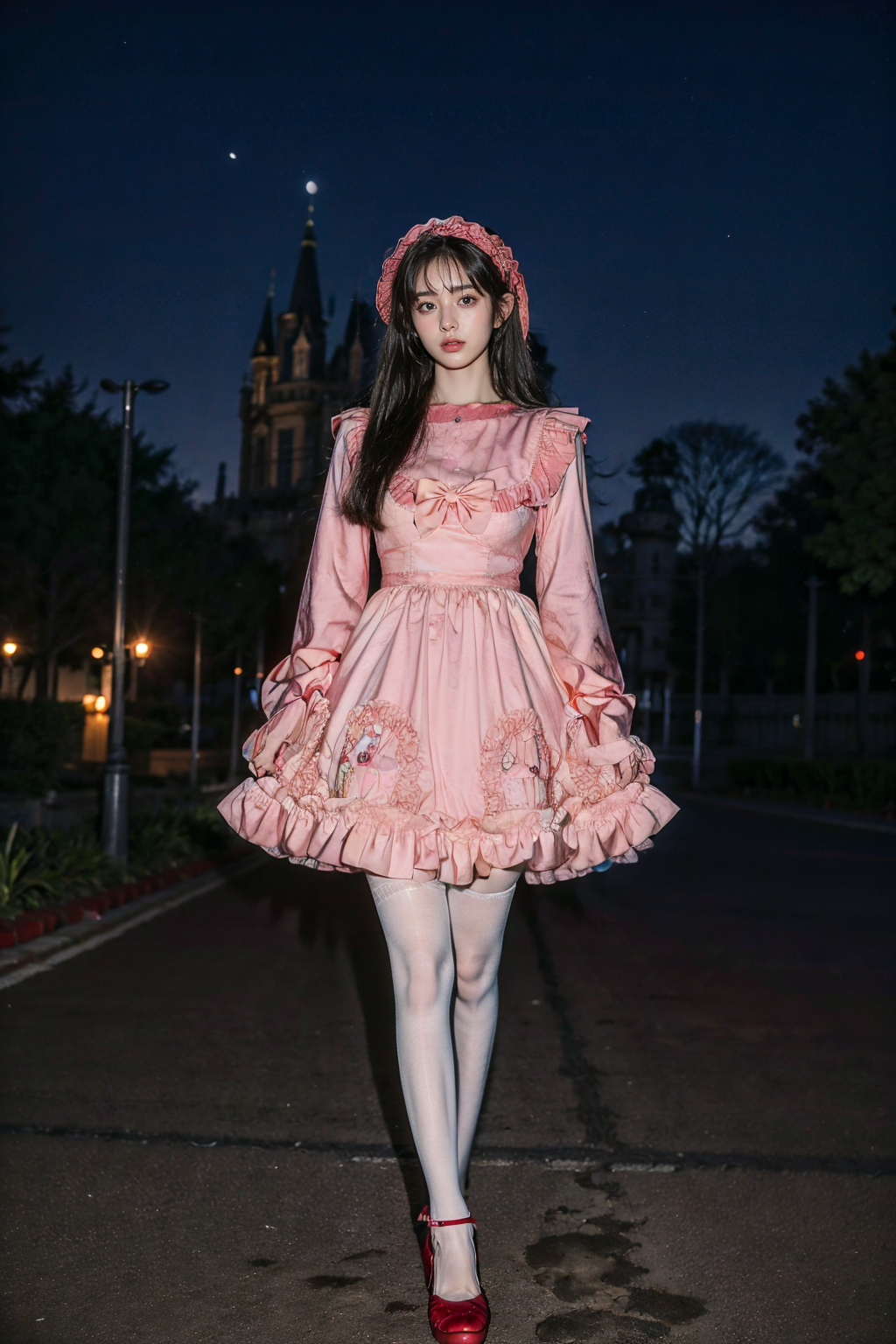 best quality, masterpiece, photorealistic, 1girl, solo, full body, long straight hair, looking at viewer, cyb dress, frilled dress, frills, gothic, bow, long sleeves, pantyhose, red high heels, castle, outdoors, moon, night, light, detailed background, <lora:gothic_attire_style1_v1:0.7>, <lora:add_detail:1> <lora:irene_v70:1>